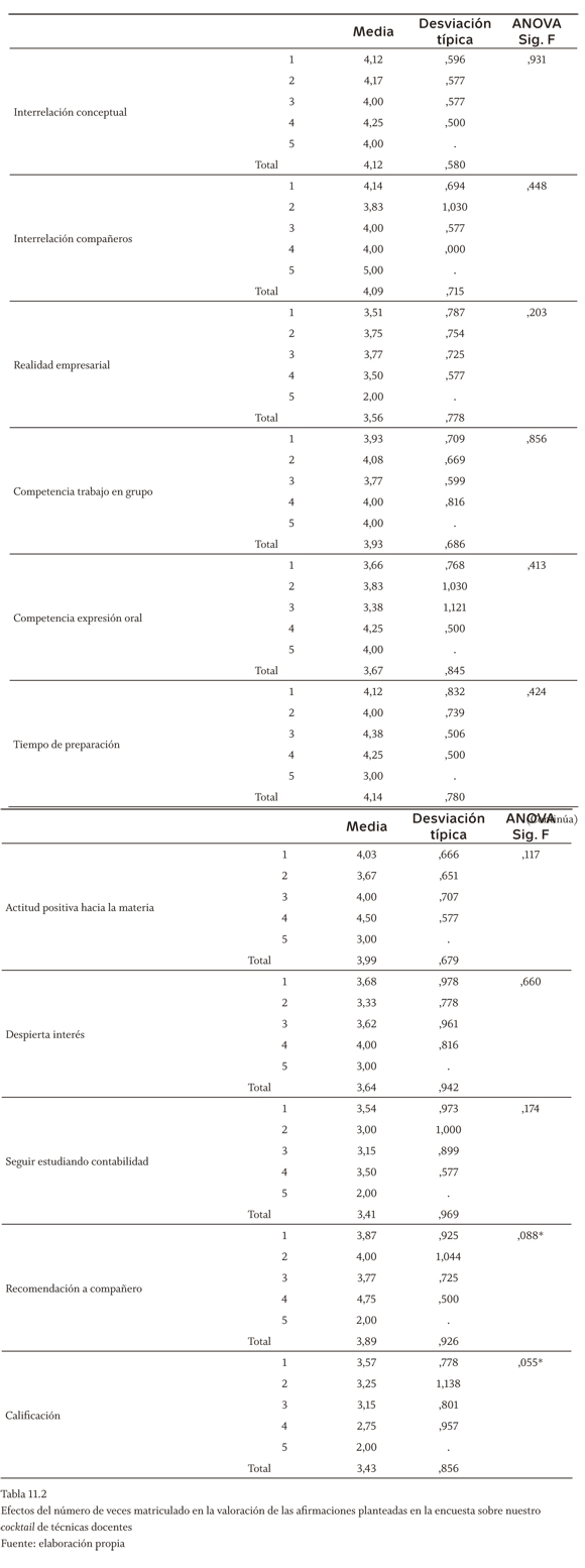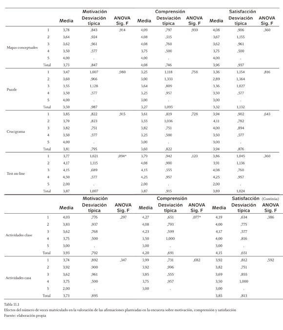 En relación con el número de veces matriculado, se observan de nuevo diferencias significativas al 5% frente a las afirmaciones planteadas en la encuesta sobre motivación, comprensión y satisfacción (tabla 11.1). Al 10% sí resulta significativo en la motivación que producen las actividades en clase y la motivación del test on-line (con los mismos signos que apuntábamos en la tabla 10.1, por los motivos ya considerados). Sobre el efecto de esta variable en el grado de acuerdo con las afirmaciones generales planteadas para el conjunto de técnicas (tabla 11.2), llama la atención que sea significativo al 10% solo para los ítems de recomendar a un compañero que se matriculara en un curso en el que se utilizaran estas técnicas (con una elevadísima media de 4,75 para los alumnos de cuarta convocatoria) y en la cuestión relativa a la calificación.