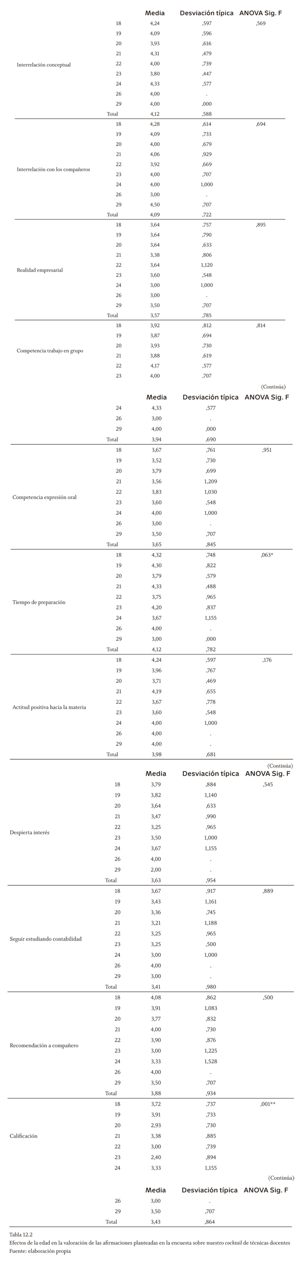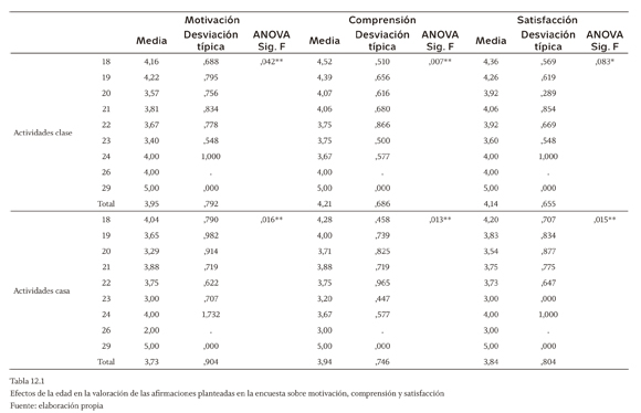La tabla 12.1 muestra que la edad es un factor explicativo al 5% del grado de acuerdo con todas las afirmaciones planteadas en la encuesta sobre motivación, comprensión y satisfacción relativas al mapa conceptual y a las actividades en casa (con la edad disminuye el grado de acuerdo, probablemente porque los estudiantes han trabajado con estas técnicas en otros ciclos del sistema educativo). Al 5% es también explicativo del grado de acuerdo sobre la motivación y la comprensión conseguidas con las actividades en clase y al 10% de la satisfacción conseguida con las actividades en clase y la comprensión alcanzada con el test on-line. Por otro lado, la tabla 12.2 pone de manifiesto que al 5% de significatividad, la edad explica que los estudiantes consideren que debería otorgárseles mayor peso a la realización de estas técnicas en la calificación final y al 10% resulta significativo su diferente grado de acuerdo con la necesidad de tener que dedicar más tiempo a la asignatura, como consecuencia de la aplicación de las nuevas técnicas docentes.