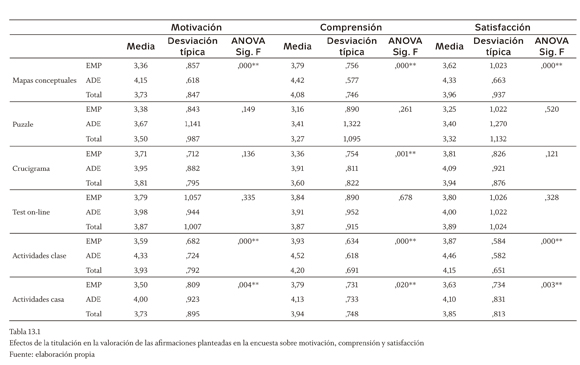 En relación con el factor titulación, la tabla 13.1 muestra diferencias significativas al 5% en el grado de acuerdo con las afirmaciones planteadas en la encuesta sobre motivación, comprensión y satisfacción sobre mapas conceptuales, otras actividades en clase y en casa, y en la comprensión de los contenidos que se consigue por medio del crucigrama, pero no en el resto de ítems. Curiosamente, los alumnos que cursan ADE ofrecen unas contestaciones con grado de acuerdo de media ligeramente superior al de EMP. Ello podría ser debido a la mayor familiarización de los estudiantes que proceden de bachillerato con estas técnicas o bien a las peculiaridades propias del grupo y la dinámica de las clases. Esto mismo sucede en todas las respuestas a las afirmaciones sobre el conjunto de técnicas, en las que se obtienen diferencias significativas en todos los ítems al 5%, salvo en la mejora de la competencia de trabajo en grupo y la interacción con compañeros, en las que no hay diferencias significativas (tabla 13.2).