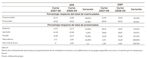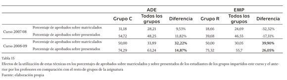 Los apartados anteriores de valoración de los resultados de la investigación realizada, se han basado en el análisis de un conjunto de impresiones u opiniones de las partes implicadas en la misma. A continuación, se comentan los resultados objetivos de estas técnicas docentes por su efecto en la calificación de los estudiantes. Para ello se procede a comparar los resultados de las actas de junio de los dos grupos en los que se ha llevado a cabo la experiencia el curso 2008-09, con los resultados de los estudiantes de estos mismos grupos en los que impartieron docencia el curso anterior los mismos profesores sin hacer uso de estas nuevas metodologías de enseñanza (tabla 14). Igualmente, se procede a la comparación de los resultados de los estudiantes de estos profesores con respecto al total de los grupos de cada titulación (tabla 15).