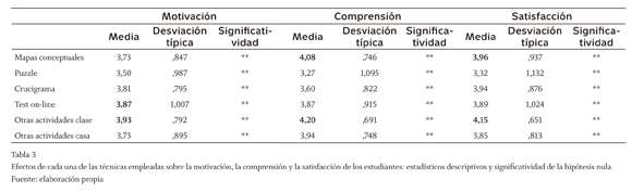 En primer lugar, se pidió a los estudiantes que valoraran si la utilización de cada una de las técnicas empleadas contribuía a incrementar su motivación en clase, si mejoraban su comprensión de los contenidos y si les gustaba realizarlas.