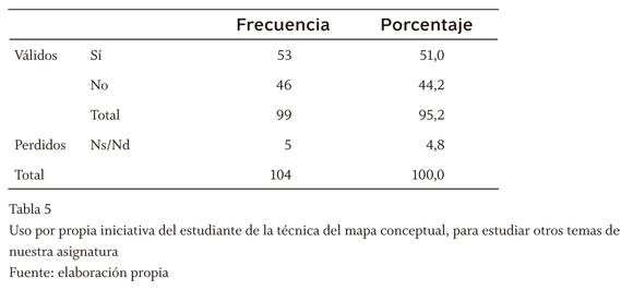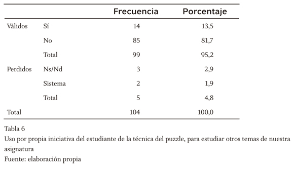 Al explicar a nuestros estudiantes las técnicas del mapa conceptual y del puzzle, se les animó a que las utilizaran por su cuenta para mejorar su rendimiento académico. No obstante, preguntados sobre si las han utilizado, de hecho, para preparar otros temas de la asignatura, observamos que el mapa conceptual sí ha sido utilizado en un nada despreciable 53% de los estudiantes encuestados (tabla 5), si bien el puzzle por sus especiales características de necesidad de grupos, expertos y autorización por parte del profesor (ofrecida en clase y en horas de tutorías) ha tenido un éxito menor (un 13,5% de los estudiantes encuestados, tabla 6).