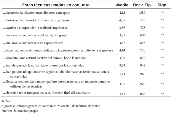 Una vez valoradas de forma individualizada cada una de estas técnicas, se pidió a los estudiantes que valoraran el conjunto de técnicas empleadas (tabla 7). La hipótesis nula para cada una de estas cuestiones será que los alumnos son indiferentes a nuestro planteamiento general para cada uno de los ítems planteados (es decir, la hipótesis alternativa será que están de acuerdo con nuestra afirmación, esto es, contrastaremos que el valor de la media es superior a 3). Se procedió a realizar un contraste de medias, con la prueba T de Student. Los resultados obtenidos son siempre significativos con un nivel del 5%.
