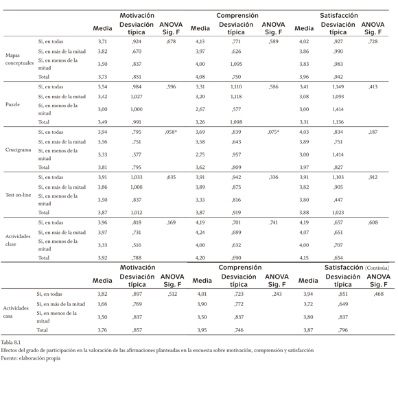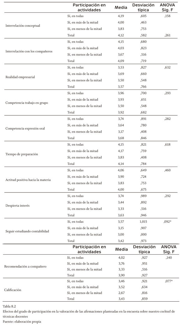 Así, la tabla 8.1 muestra que el grado de participación no es explicativo al 5% de significatividad y en ningún caso del grado de acuerdo respecto a nuestras afirmaciones sobre las técnicas concretas. En general, aunque no ocurre así en algunos casos, se puede señalar que las medias de acuerdo tienden a bajar, cuando baja la participación. Al 10% de significatividad, solo hay diferencias respecto a la motivación y la comprensión que se derivan del crucigrama, cuyo grado de acuerdo mejora con el nivel de participación en las técnicas. Por su parte, la tabla 8.2 pone de manifiesto que tampoco puede este considerarse un factor explicativo al 5% de significatividad del grado de acuerdo de los estudiantes con las afirmaciones planteadas para el conjunto de técnicas. Al 10%, no obstante, se podría señalar que este factor sí explicaría el interés por seguir estudiando contabilidad o que consideren que debería otorgárseles mayor peso a la realización de estas técnicas en la calificación final.