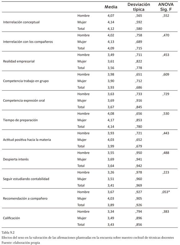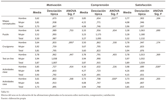 En relación con el factor sexo, no se encontraron de nuevo diferencias significativas al 5% en cuanto a las afirmaciones planteadas en la encuesta sobre motivación, comprensión y satisfacción (tabla 9.1). No obstante, resulta curioso que en casi todas las respuestas, las mujeres tengan normalmente niveles de acuerdo superiores a los de los hombres. Al 10% de significación sí que las mujeres se muestran más positivas que los hombres respecto a la motivación que les produce el crucigrama, a la comprensión alcanzada con las actividades en casa, o a la satisfacción que les producen las actividades en clase. En lo relativo al conjunto de técnicas docentes (tabla 9.2), el sexo no explica jamás el grado de acuerdo en las respuestas a un nivel de significatividad del 5%. Tan solo al 10% es significativo que las mujeres más que los hombres recomendarían a un compañero que se matriculara en un curso en el que se emplearan estas técnicas docentes.