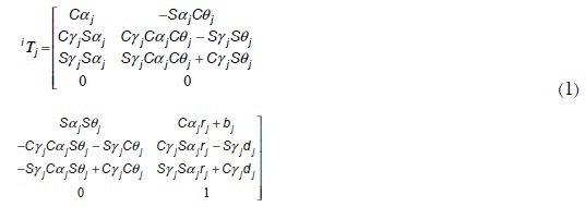 Los parámetros θj son las variables de cada articulación rotoide; dj hace referencia a la longitud de cada falange; αj al ángulo entre ejes Xj; bj la distancia entre los ejes de cada dedo; rj representa la distancia en tres ejes Zj; σj determina que el tipo de articulaciones utilizadas son todas rotoides, y γj representa el ángulo del dedo pulgar respecto a los otros dedos (definido igual a 45°).