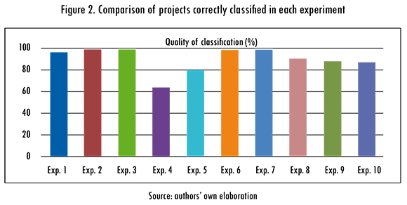 Experiment 6 obtained the best results with an average error equal to 2.907e-9 during training. The average validation error (3.176e-9) takes a lot better than the rest of the experiment values. The predictive accuracy metric (percentage of correctly classified projects) is applied to measure the quality of classification in project evaluation given by each experiment, yielding the results shown in Figure 2.