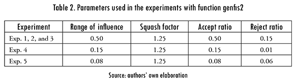 In the first set of experiments the genfis2 functionality is used to generate the initial rule base by grouping the input-output data. Table 2 shows the parameters used in each experiment with the genfis2 function.