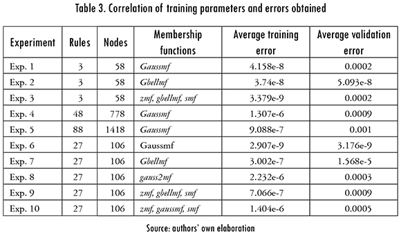 In considering the scheme of training error curves and validation error, the parameters of fuzzy sets are determined just before the iteration where the FIS over-training occurs. Through the training and validation of FIS, the parameters of the fuzzy sets of the rules are adjusted. Once the experiments are applied, it is necessary to compare the results. In Table 3 training and validation errors are shown, which allows us to compare the performance of the 10 experiments performed to optimize the FIS project evaluator.