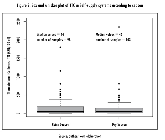 Despite median TTC levels below 50 CFU/100 mL, microbial water quality was variable. TTC counts in rainy season ranged between 0 and 1800 CFU/100 ml. In dry season the range was 0-2360 CFU/100 ml. In addition, the standard deviations were 279 CFU/100 ml and 271 CFU/100 ml in rainy season and dry season, respectively. Greater quantity of atypical data occurred during the rainy season, but the magnitude of the atypical data was greater in dry season (Figure 2). Thus, the systems had peak TTC levels for both dry and rainy season, estimated around 2000 CFU/100 ml, which demand the introduction of measures to reduce the risk for human health when sudden events of pollution occur. These sudden events or pulses of microbial pollution in dry season were found by Levy et al. [30] in Ecuador associated to sporadic rains during said season.