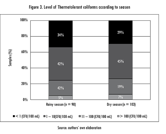 Figure 3 shows TTC levels according to the season. It is worth noting that 5% of samples were in the category of less than 1 CFU/100 ml for dry season and 7% for rainy season, meeting the microbial WHO standard. Two among the 26 participating households (8%) met the standard for both rainy and dry season. The WHO standard has been achieved by 27% of Self-supply systems in Madagascar [8], from 5 to 47% systems, depending on source types in Ethiopia [2], and by around 35% in Zambia [6]. In all the international studies reviewed, self-supply systems depend on groundwater sources, and no studies were found from the perspective of Self-supply where systems relied on surface water sources such as Calabazas. However, the comparison between the Calabazas case and the international cases shows that, regardless of the water source and the specific contexts, individual families are able to build and operate systems that provide water with less than 1 CFU/100 ml, and the potential to adopt incremental approaches with external support to help systems failing to meet the standard to improve the delivery of safe water [2], [3]. These results support calls to consider Self-supply as a complementary strategy that allow countries to progress towards achieving universal access to safe water [2], [4], [5].