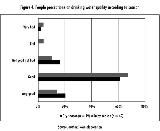 In most homes people had positive perceptions of their drinking water quality. In rainy season and dry season, 81% of households believed water quality was good or very good (Figure 4). These high levels of positive perceptions may be related to the direct involvement of families in the selection, operation, and maintenance of their systems. This is consistent with the reported strong sense of ownership of users towards the systems they have developed through their own efforts [2], [6]-[8]. On the other hand, this also shows the challenge of making people aware of the risks associated to their sources of supply, especially when there are no data available from water quality surveillance. In Colombia, water quality surveillance from sanitary authorities covers only 57% of the rural population, using collective systems [34]. In Madagascar, results from focus groups discussions revealed that some owners believed their water was potable, even though these water was untreated [10]. This highlights the need to support Self-supply users with education, technical advice, and water quality monitoring and surveillance to realise and mitigate the risks that are present in these systems (i.e. pollution pulses).