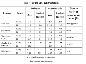 Regarding water quality in the main stream, a basic characterization carried out within this research (Table 1) shows that despite a small decline from upstream to downstream in conductivity, other parameters remained at levels that characterize unpolluted water bodies. The variation of parameters such as Temperature, Dissolved Oxygen (DO), and pH had a closer association with geology and topography than with land use. This coincides with findings from a study in another small Andean catchment from Valle del Cauca Department (Colombia) [20]. Biochemical Oxygen Demand (BOD) and Total Suspended Solids (TSS) are not included in Table 1 because their values were always below the detection limits of the methods used (BOD < 3.0 mg/L, and TSS < 5 mg/L). Thus, despite land use change and human influences, Calabazas could be considered an unpolluted source.