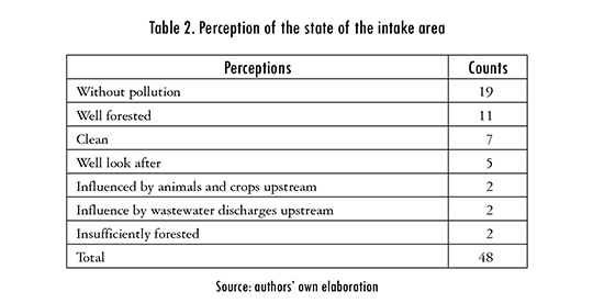 Based on people perceptions on the good status of the intake areas (Table 2), mostly associated to be free of pollution and well forested, it could be inferred that Self-supply users made efforts on the protection of surrounding areas and preservation of their native forest. Protection of sources is considered one of the most effective strategies for providing safe water, since it can result in significant reduction of capital costs and Operation and Maintenance (O&M) [35]. In the cases in which the perception of the intake status was negative (6/48), people understood it was due to the influence of wastewater discharges, animals or crops upstream, or insufficient forests. In addition, users tried to take water from sites free of pollution sources, and with coverage of native forest, which could contribute, together with sanitation, to reduce the impact of the rainy season over microbial water quality which is normally reported in the literature [28], [30].