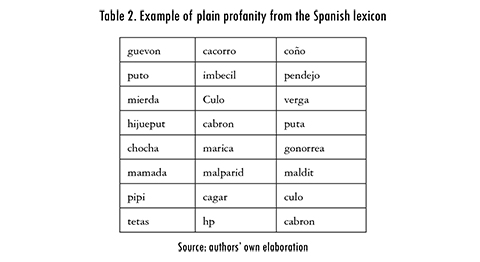 Associated with this dataset, we also gathered a lexicon of 60 Spanish swearing terms, varying in length, the mode being 4-6 letters long (60%), with extremes being three 9 letter-long and one 2-letter long words. Excerpts of the datasets are illustrated in Table 1 and Table 2.
