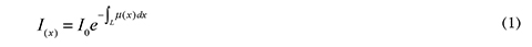Considering a ray with intensity I0, which passes through the object with a non-homogeneous attenuation distribution p,(x), the ray intensity I(x) measured by the detector D depends on the distance x passed through and the attenuation p,(x) of each point in its trajectory. This can be modeled as: