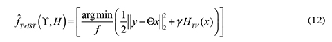 where ψ is a sparse representation basis, Θ is the compressive sensing matrix, x is the sparse coefficients vector, the parameter T is a regularization constant, and ||·||1 and ||·||2 correspond to the l1 y l2 norms, respectively.