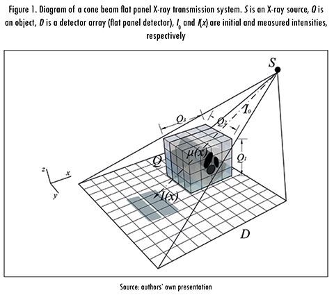 Figure 1 shows an object Q discretized when it is lightened with X-rays from a source S. This representation is composed of voxels that form Q1 cross-sections or slices, each one with Q2 X Q superficial dimensions. For each voxel (with dimensions dx X dz X dz) an attenuation a is allocated.
