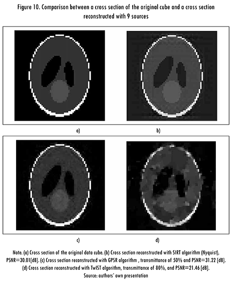Results of reconstructed cross sections of the synthetic data cube are presented in Figure 10. Figure 10a shows a cross section of the original data cube, Figure 10b shows a cross section reconstructed with the SIRT algorithm (traditional method), using a source array of 3 X 3 (PSNR = 30.01 [dB]); Figure 10c shows a cross section reconstructed with the GPSR algorithm, using a source array of 3 X 3 and coded apertures with transmittance of 50% (PSNR = 31.22 [dB]); and Figure 10d shows a cross section reconstructed with the TwIST algorithm, using a source array of 3 X 3 and coded apertures with transmittance of 80% (PSNR = 21.46 [dB]). It can be noted the quality of the reconstructed image with the GPSR algorithm is higher than the quality obtained by other algorithms.