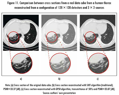 In addition, in Figure 11 reconstructed cross sections from a real data cube of a human patient thorax are shown. The configuration used for this slice was a detector matrix of 128 X 128 and 9 sources, and the compression ratio was 0.33 as it is shown in Figure 4b. Figure 11a shows a cross section of the original data cube. Figure 11b shows a cross section reconstructed with SIRT algorithm (Nyquist), PSNR=33.37 [dB]. Figure 11c shows a cross section reconstructed with GPSR algorithm, transmittance of 50% and PSNR=35.07 [dB].