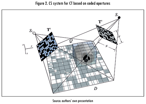 Data reconstruction in traditional CT is performed from projections obtained in a detector that measures the X-ray attenuation after they pass through the object. To implement the CS theory in a CT configuration it is possible to include coded apertures that allow coding the measurements to take compressed samples. Coded apertures are two-dimensional arrays with patterns of opaque materials; sections that do not contain opaque material define the transmittance of the aperture, that is, the light fraction that can pierce them [7]. In CT, this parameter can define the quantity of radiation that the object receives from each projection.