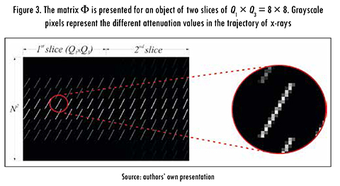 where P is the total number of sources, Φ is the sensing matrix, and Θ is the CS matrix for CT. Figure 3 illustrates a sampling matrix Φ for an object of two slices of Q1 X Q3 and a detector array of N2 where each row represent the trajectory of a single X-ray and the grayscale values represent the different attenuation values.