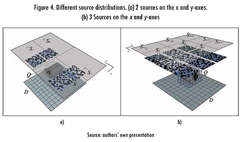 The number of sources used in the CCT configuration may vary. Also, they are disposed in an array. Figure 4 shows some examples of source distributions. Figure 4a illustrates a distribution of 2 sources on the x and y-axes, Figure 4b shows a distribution of 3 sources on the x and y-axes.