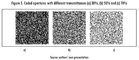 Figure 5 illustrates different Boolean random matrixes representing coded apertures like the ones used in this work. Figure 5a shows one coded aperture with a transmittance of 30%, Figure 5b with a transmittance of 50%, and Figure 5c with a transmittance of 70%, this means that 30%, 50% and 70% of the elements, randomly distributed, of the apertures allow light crossing, respectively.
