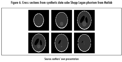Taking into account the system illustrated in Figure 2, in order to verify the CCT design, two configurations are tested. Firstly, a synthetic data cube Shepp Logan Phantom from Matlab R2015a MathWorks with images of 64 X 64 and 6 slices (Q = 24576) are used, the detector and coded aperture are configured in 64 X 64 pixels. Figure 6 shows some cross sections of the synthetic data cube.