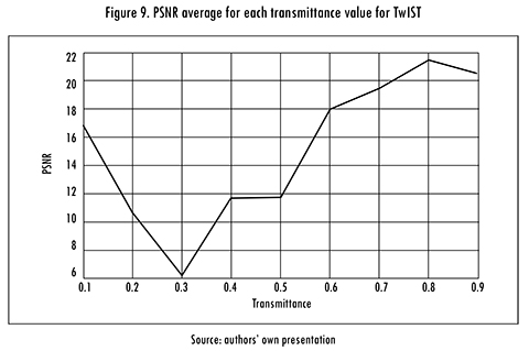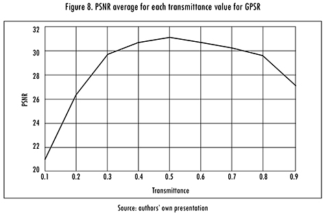 Figure 9 shows the results of simulations performed for the TwIST algorithm were the best result was achieved with a transmittance value of 80%. However, it is lower than the GPSR results.