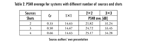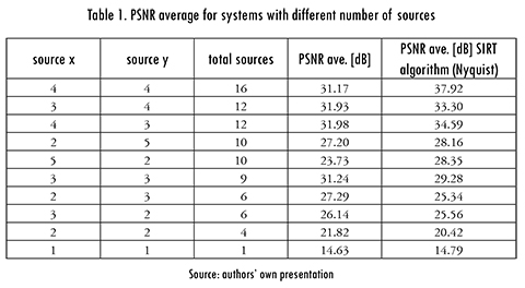 The first parameter to consider was the number of sources, for this experiment coded apertures with a transmittance of 50% were used, and the compression ratio was 0.5, established because that is the mean value. The average results obtained from the reconstruction with the GPRS algorithm are presented in Table 1. In the last column, the results of 200 iterations of the SIRT algorithm are included as a traditional reconstruction reference.