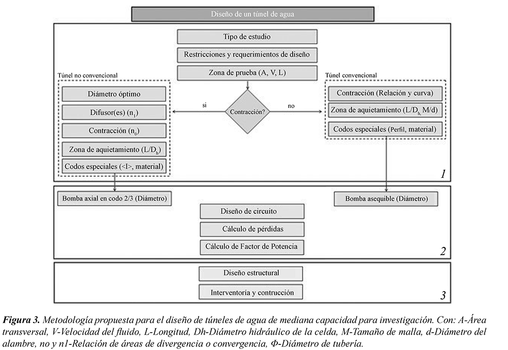 El análisis de la información presentada en referencias como Gleed & Saiva (1967) y Ripken (1951), ha permitido proponer una secuencia de pasos para el diseño de algunos túneles de agua convencionales en el caso de Ibarra (2010), aquellos que cuentan con una contracción previa a la Zona de pruebas. En esta investigación se extiende el alcance y se propone una metodología para el diseño de instalaciones con difusor previo pensando en la reducción en la cantidad de agua, costos de construcción y mantenimiento, y materiales disponibles en el mercado nacional. La metodología, ilustrada en la Figura 3, tiene tres pasos de diseño para: La zona principal (zona de prueba y elementos inmediatamente anteriores y posteriores), el sistema de bombeo (tubería, accesorios), y por último, las fases generales de la construcción.
