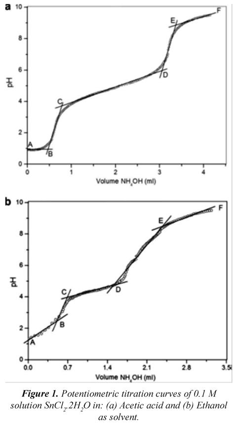 Figure 1 shows pH change when doing titration with ammonium hydroxide of SnCl2*2H2O dissolutions using acetic acid and ethanol as solvent. Through addition of SnCl2 in acetic acid, it is expected that the mains species in solution would be anionic compounds, because of the complexing nature of the ethyl anion; the most important species in the solution would be the tin tricarboxylate ones (II) [Sn(RCO2)3].