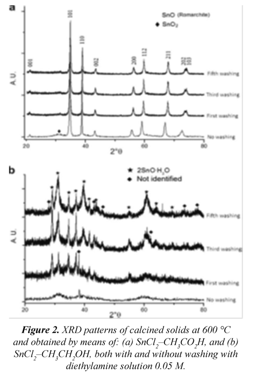 Figure 2 (a) shows the X-ray diffractogram of the solid obtained from the SnCl2-CH3CO2H at pH 8.0, where a crystalline romarchite phase is mainly found according to the JCPDS 06-0395 files. A small formation of cassiterite SnO2 (JCPDS 211250) is observed in the unwashed system. These results allow concluding that it is possible to obtain SnO by employing acetic acid as a solvent with a small formation of SnO2. When the cleansings are done with an aqueous dissolution of 0.05 M in diethylamine, the presence of the crystalline romarchite phase is exclusively observed. Figure 2(b) shows the diffractograms of prepared solids in ethanol at pH 6.5, being observed that in the unwashed sample an amorphous solid with the presence of an incipient formation of cassiterite (SnO2) is found. Furthermore, when the elimination of the chlorines with the diethylamine solution is carried out, the crystallization of a romarchite hydrate is favored SnO*2H2O (JCPDS 07-0194). The presence of other peaks is also observed, but they are not related to any reference compound in particular. Of the previous results, it can be concluded that when using acetic acid as a solvent and taking the pH to 8.0, a crystalline romarchite phase is obtained, whilst upon employing ethanol as a solvent and afterward taking the pH to 6.5 the crystalline phase obtained in this simple after thermal treatment to 400 °C was cassiterite.