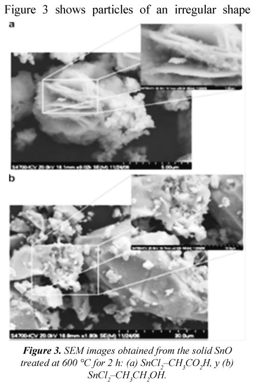 Based on the obtained results, it can be concluded that for the synthesis of the tin oxide the type of solvent has an influence on the synthesis process and it affects the morphology and the size of the particle. Indeed, when employing acetic acid, the presence of polynuclear species [Sn2(OH)4O]2-is favored, in which the oxygen bridge would allow the stability of the pyramidal structure Sn(II) and polynuclear species like [Sn2(OH)2]2+, [Sn3(OH)4and [SnO(OH)2]2-could be formed too. The union of these polynuclear species would allow the growth of the embryos which, upon reaching critical size, would develop tin-oxy type complexes, benefitting the formation of SnO.