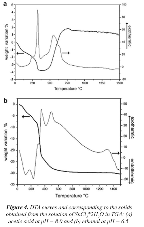 Figure 4(a) shows the DTA/TGA curve of the precipitate solids at pH 8.0 with acetic acid as a solvent. In the TGA curve, the loss of a small weight below the 100ºC is due to the loss of adsorbed water. The weight loss between 200-250ºC, as is with the exothermic peak in the DTA curve, might be associated with water and ammonia, chemically and structurally absorbed. At 300ºC there is weight loss associated with the exothermic peak in the DTA curve which indicates organic matter combustion and the oxidation of the hydroxyl groups (F. Lui et al, 2005). The TGA curve at higher temperatures between 400 and 700ºC may be associated with the SnO oxidation or with the SnO disproportion expressed in the following equations: