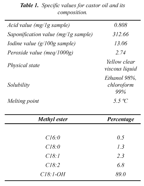Table 1 shows the values of the different determined rates for the commercial castor oil.