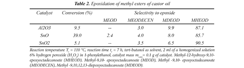 Researchers conclude that the catalyst produces a selective transformation of cis-methyl oleate in cisepoxioleate under much more cleaner conditions, due to the use of a stoichiometric amount of of hydrogen peroxide and the suppression of solvent in the medium of reaction. Such a result is probably due to a synergic effect between the hydrogen peroxide and the air oxygen at a low temperature 313K, though they also state the possibility of a low dimerization of the methyloleate due to catalyst saturation because of the air oxygen. As far as the tin oxide is concerned, this is a system with good affinity with the carbonyl and carboxyl functions, it is confirmed that it enhances its capacity when a second element is incorporated (P.J. Smith, 1998). Among the incorporated elements for such purpose there is phosphorus, antimony, vanadium, chromium, molybdenum, manganese, and copper. These systems have been used to promote the oxidation of carbon monoxide, sulfur dioxide and saturated and unsaturated hydrocarbons, as well as other organic compounds. Palladium can also be used in methane oxidation (K. Skizawa et al, 2000) and for the oil transesterification processes and for dimethyloxalate, where tin oxide is mixed with other solids, such as SiO2, ZnO, and TiO2 (J. Urresta et al, 2000, S.Wang et al, 2004 and S. Verdier et al, 2003). Finally, in the present work a tin oxide type romarchite and casserite was synthesized, through the method of controlled precipitation. The solid obtained was used in the methyl esters epoxidation reaction resulting from the castor oil plant with hydrogen peroxide as oxidizing agent.