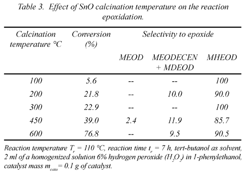 3.6 The effect of the SnO calcination temperature on the epoxidation reaction