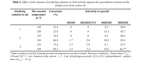 In table 4 the results of the epoxidation results for the SnO at different calcination temperatures are shown. In the figure 5 it can observe that the efficiency increases in the measure that the temperature of the thermic treatment does so as well with a slight exception at 300ºC, being the thermic treatment at 600ºC the one that presents the highest conversion percentage in the epoxidation reaction. The selectivity remains practically constant for the 5 tested thermic treatments, being the majority product the methyl-12-hydroxy-9, 10-epoxyoctadecanoate (MHEOD).