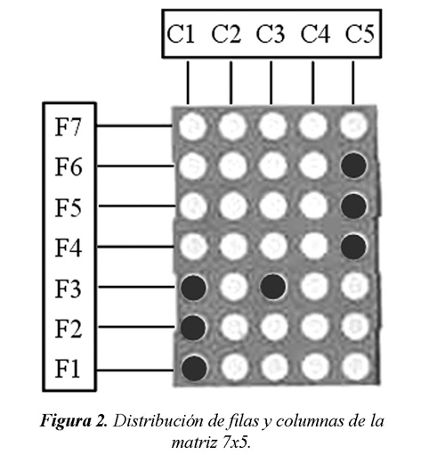 Para encender un conjunto de LED's sobre la matriz se debe hacer un "barrido de columnas", esto quiere decir habilitar secuencialmente cada columna (PA2 - PA0, puerto A de la PPI hacia el decodificador de 3 a 8) al mismo tiempo que se pone un dato en las 7 líneas de las filas correspondientes (PB6 - PB0, puerto B de la PPI), si la columna está habilitada y se pone un "0" sobre una de las filas, se enciende el led correspondiente, la distribución de filas y columnas se puede ver en la Figura 2. Se tiene con lo anterior, que cuando se habilita la columna 1, se pone sobre las filas el dato correspondiente a la posición del jugador 1, las columnas 2,3 y 4 son para el desplazamiento de la pelota y por último en la columna 5 se pone el dato correspondiente a la posición del jugador 2.