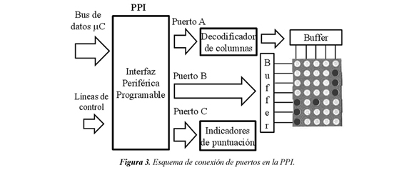 La habilitación de las columnas se realiza por medio de un decodificador de 3 a 8 conectado a los bits menos significativos del puerto A de la PPI, y las filas se conectan directamente en los 7 bits menos significativos del puerto B de la PPI. Por otra parte la indicación de los puntos a favor se visualiza en leds colocados en el puerto C, PC7 y PC6 para el jugador 1 y 2 respectivamente, el diagrama completo del esquema de conexión de puertos en la PPI se muestra en la Figura 3. Para visualizar correctamente el juego sobre la matriz, se debe asegurar una suficiente circulación de corriente en los leds que garantice una buena intensidad de luz. Para ello y para la protección de los dispositivos electrónicos, se utilizaron buffers entre las salidas de la PPI y la matriz de LED's. Para las columnas se empleó un buffer inversor 74LS240 y para las filas un buffer no inversor 74LS244.