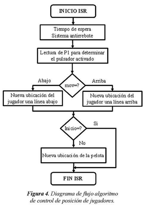 En la Figura 4 se muestra el diagrama de flujo de la ISR de la interrupción externa 0 que corresponde al jugador 1, este diagrama es similar para la interrupción externa 1 que corresponde al jugador 2. La posición de los jugadores se almacenan en las variables "posicionjug1" y "posicionjug2" respectivamente, estas variables se cargan inicialmente con "11100011" (E3H), los ceros en el dato indican cuales son los leds encendidos. Como se mencionó anteriormente se toman los 7 bits menos significativos para la visualización en la matriz, esto quiere decir que la posición del jugador 1 y 2 inicia en la mitad de las filas y dependiendo de la solicitud de los pulsadores, el dato almacenado en la variable se desplaza a la izquierda o a la derecha. De igual forma la posición de la pelota se almacena en la variable "posicionpelota" y se carga con "11110111" (F7H), el cero en el bit 3 significa que la pelota inicia ubicada en la mitad de las filas.