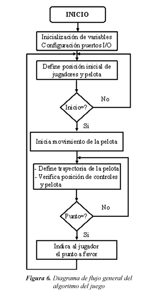 El diagrama general del juego se muestra en la Figura 1. El juego consta de: (1) dos jugadores que por medio de un control manual controlan el movimiento de las raquetas (izquierda, derecha): Ellos se ubican en la primer y última columna representados con tres LED's encendidos permanentemente que simulan las raquetas; (2) un interruptor que define el inicio del juego o la reanudación: Para dar inicio al juego se presiona el pulsador "Inicio", momento en el cual comienza el movimiento de la pelota. Después de obtener un punto se debe presionar nuevamente "Inicio" para reanudar el juego; (3) la matriz de LED's donde se desarrolla el juego: El juego se visualiza en una matriz de LED's de 7x5 que constituye el campo de juego por donde se desplaza la pelota con una componente de aleatoriedad en su trayectoria (la pelota rebota en los lados superior e inferior de la cancha), su desplazamiento se simula por medio del encendido secuencial de un led sobre la matriz; (4) un diodo emisor de luz para la indicación de un punto a favor: Por fuera del campo de juego, se tiene un diodo led para cada jugador. Este indica cuando se presenta un punto a favor el cual se logra cuando la raqueta del oponente no intercepta la trayectoria de la pelota.