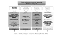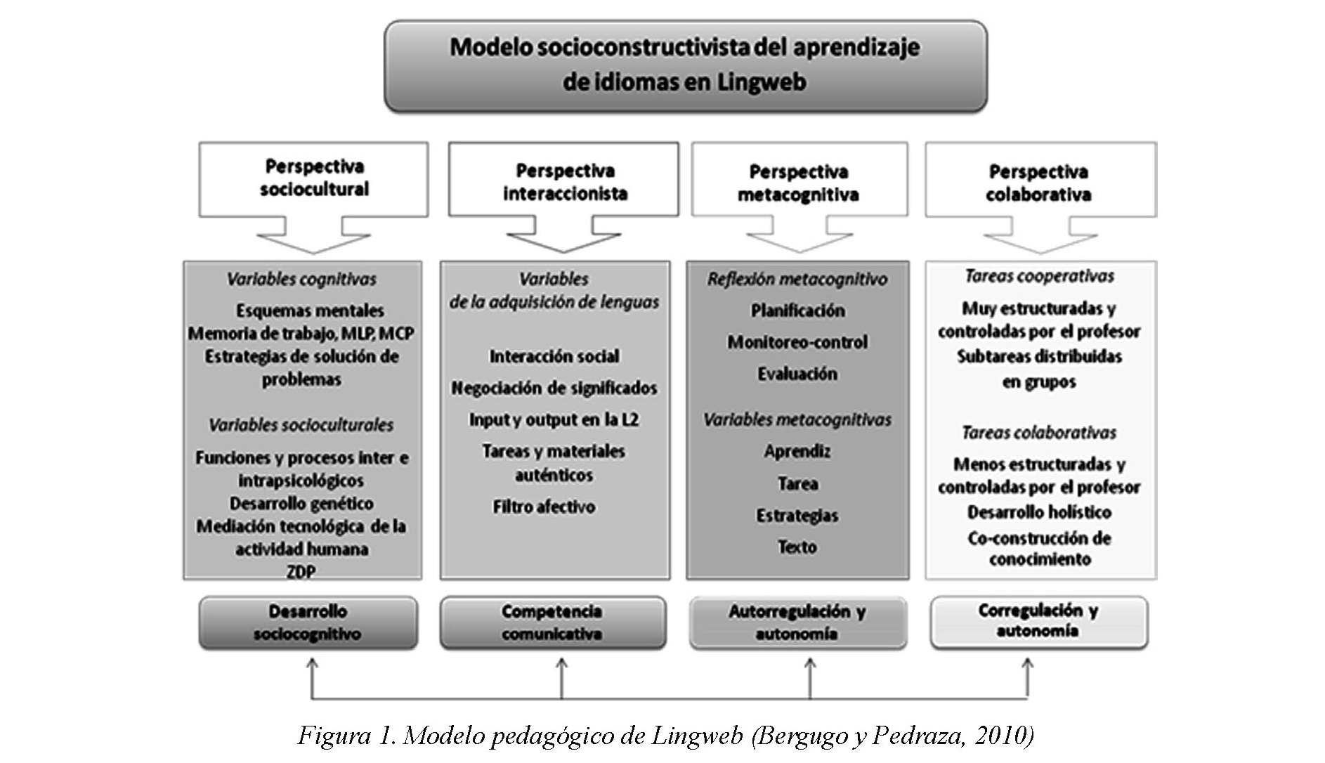 También se tomaron características del modelo pedagógico de la plataforma virtual Lingweb, el cual está basado en la concepción socioconstructivista de la enseñanza y el aprendizaje (Berdugo y Pedraza, 2010). El modelo busca ofrecer un diseño que promueva procesos de construcción de conocimiento, en particular, del conocimiento lingüístico y de las competencias comunicativas en las lenguas extranjeras, desde los planos individual y social. Se complementa con los enfoques teóricos sociocultural, interaccionista, metacognitivo y colaborativo del aprendizaje de lenguas. La representación de los cuatro principios mencionados se muestra en la Figura 1, en ella se resumen las especificaciones de cada uno. Se aprecian características cognitivas, socioculturales, la interacción en un plano real, la conciencia que se tiene del conocimiento, la colaboración y la cooperación (Berdugo y Pedraza, 2010). En cuanto a la producción textual para la enseñanza de un idioma, el modelo pedagógico se enfoca en la composición escrita por procesos, identificando tres momentos: la fase de preescritura (planeación), la fase de escritura propiamente (textualización) y finalmente la fase de revisión (Berdugo y Pedraza, 2010), estos momentos son configurados desde el diseño de los cursos en cada una de sus secuencias de aprendizaje.