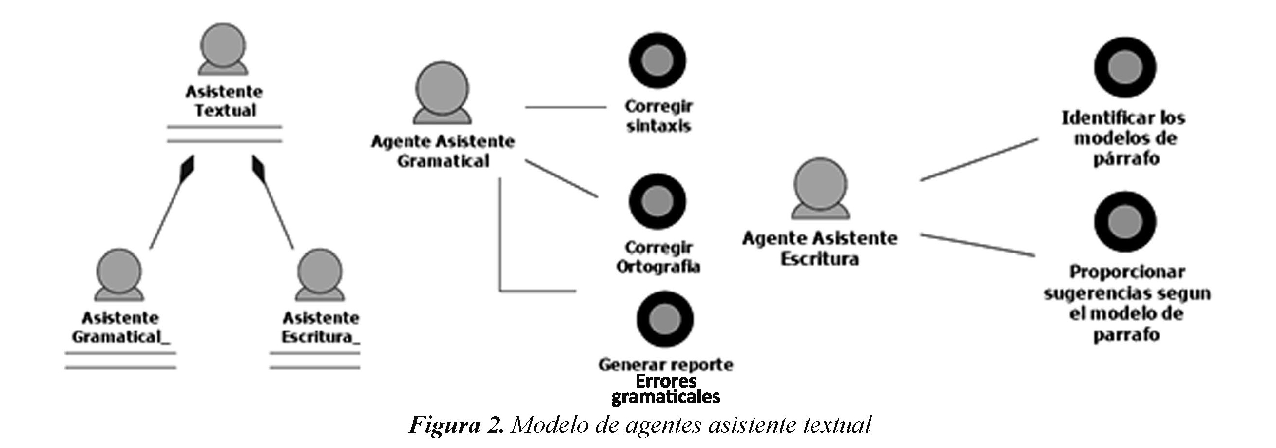 Como se mencionó anteriormente, el Asistente virtual tiene dos funciones específicas que lo definen: la asistencia de escritura y la asistencia gramatical. En la asistencia de escritura se le presenta al estudiante recomendaciones de acuerdo con el tipo de párrafo que desea escribir (recomendaciones macrotextuales) y en la asistencia gramatical se le brinda al estudiante la corrección ortográfica y sintáctica de oraciones de los párrafos o textos que produce. Estas funciones son implementadas por dos agentes de software como se aprecia en la figura 2.