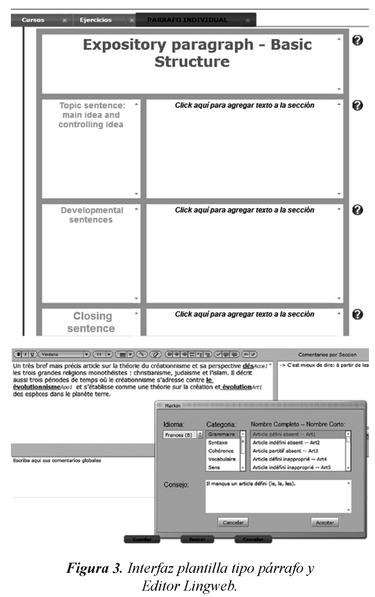 Desde el perfil del profesor se puede configurar el tipo de párrafo que debe desarrollar el estudiante, para ello se selecciona la plantilla correspondiente que ha sido creada previamente por el administrador. Esta plantilla de trabajo contiene un título, descripción por sección, campo de escritura como se aprecia en la Figura 3 y al hacer clic sobre una de sus secciones en donde dice "clic aquí para agregar texto al párrafo" se presenta el Editor Lingweb junto con el asistente de escritura como se puede ver en la Figura 6. Finalmente, las opciones de corrección ortográfica y sintáctica se encuentran disponibles en el editor avanzado Lingweb. Cada opción activa una interfaz que permite la revisión del texto según el botón seleccionado.