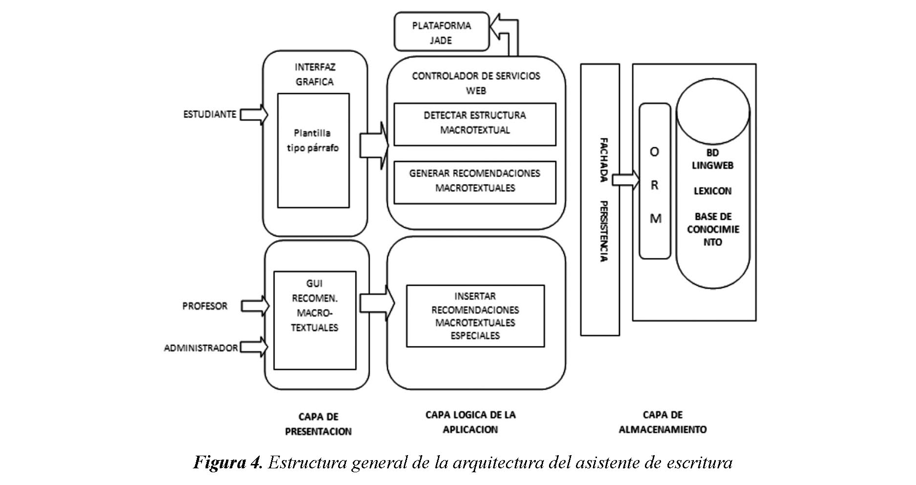 De acuerdo a la estructura conceptual del sistema y a su arquitectura por capas, la arquitectura en Lingweb para el asistente virtual desde su función de escritura queda establecida como lo refleja la Figura 4 y desde su función gramatical en la Figura 5. Estas figuras muestran cada uno de los componentes de los asistentes y la función que desempeñan.
