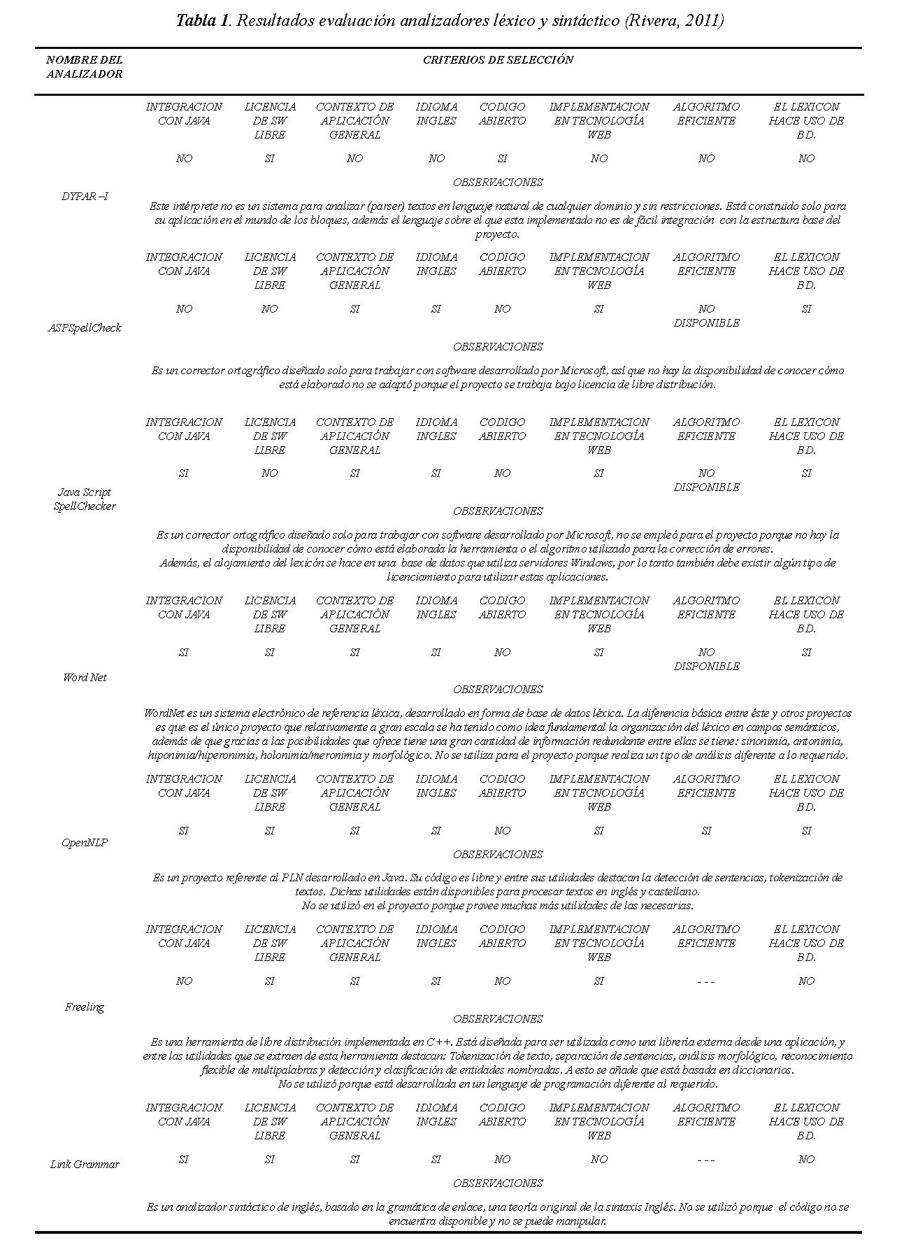 Se estudiaron varios analizadores léxicos y sintácticos con el fin de evaluar su compatibilidad con Lingweb y con las funcionalidades del asistente. Los analizadores debían funcionar en ambientes web, ser de libre distribución y aplicar el procesamiento de lenguaje natural a la escritura de textos. En la Tabla 1. se presentan algunos de los resultados obtenidos del estudio de los analizadores explorados. Debido a que ninguno de los analizadores estudiados cumplió con las características necesarias para realizar el asistente virtual, se optó por seleccionar algunos elementos de estos analizadores y desarrollar nuevos componentes de acuerdo a lo requerido para el asistente con relación al lexicón, analizador ortográfico y analizador sintáctico.