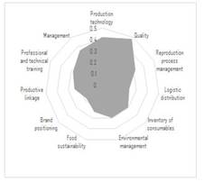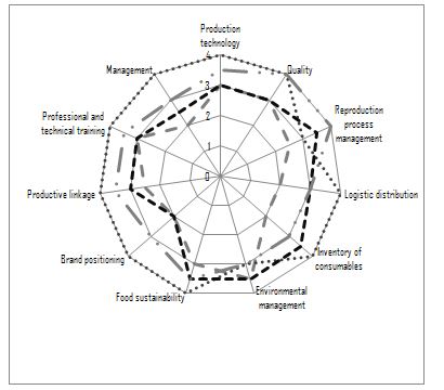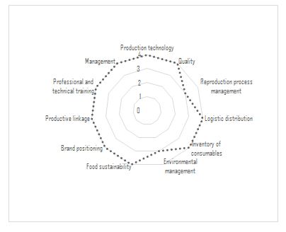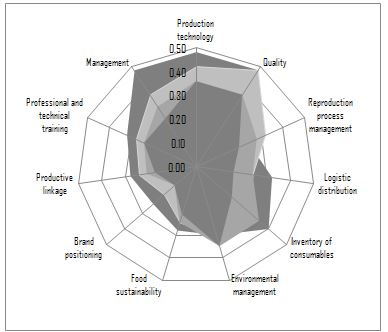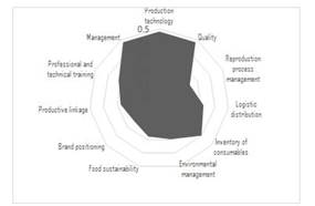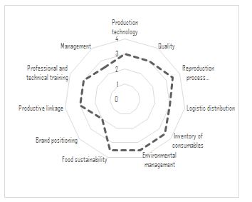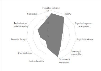 Organization B (Figures 3 and 4), leader in the region of Valle del Cauca, presents and excellent performance in the following factors: production technology, brand positioning, productive linkage, competent staff, quality management system, logistic distribution, food sustainability, management and raw material handling. However, it has an acceptable performance in reproduction process management, environmental management and environmental protection 37.